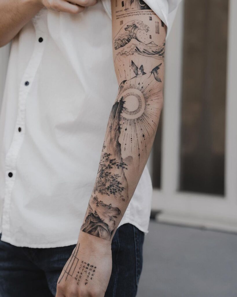 Featuring dragons, koi fish, and Hannya masks, Irezumi tattoos are rich in symbolism—courage, protection, and perseverance. Traditional elements like cherry blossoms and wind bars create movement and cohesion across the arm.