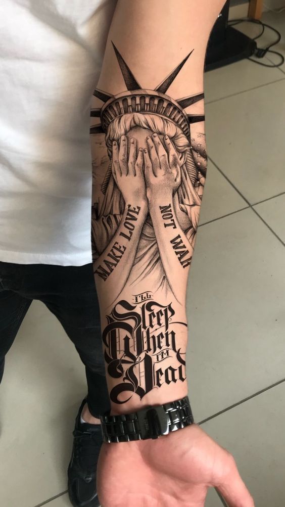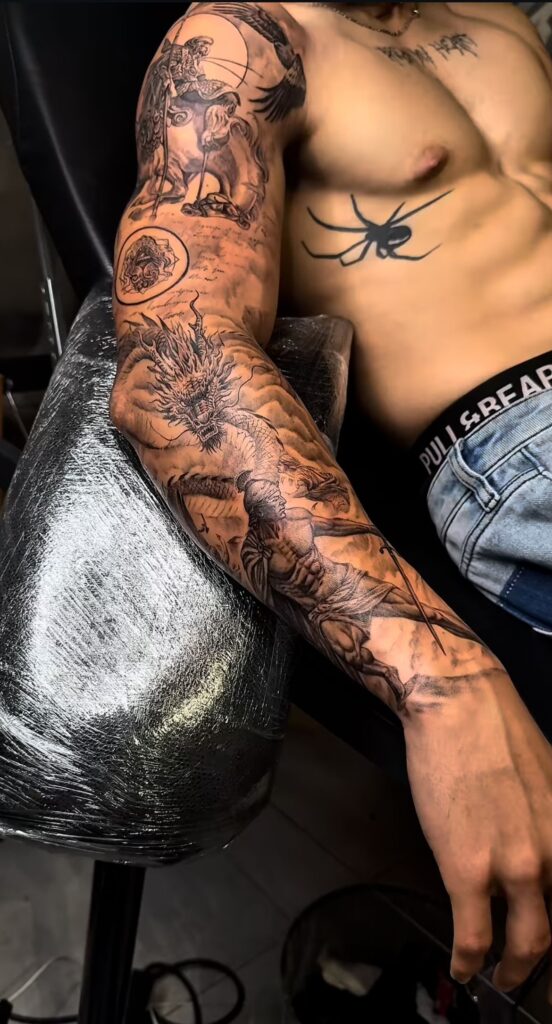 Crosses, mandalas, deities, or sacred texts can form a sleeve that reflects faith, devotion, and spiritual journey.
